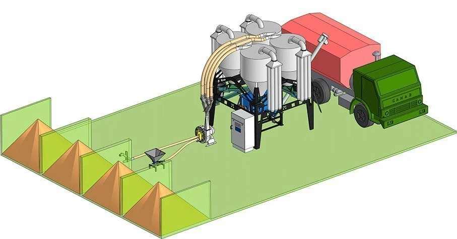 У МКУ оператор повинен послідовно через пневможивильник (і молоткову дробарку) завантажувати компоненти рецепту, орієнтуючись на звуковий сигнал автоматики управління. При цьому бункер завантажується набір компонентів на 1 заміс.