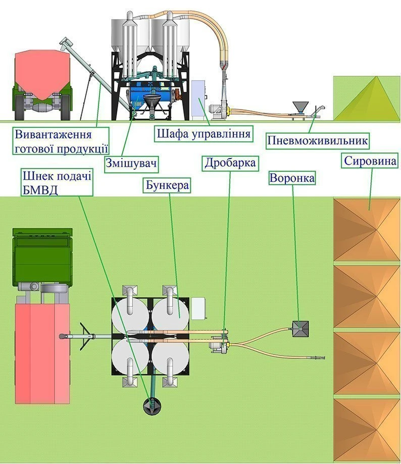 Установка призначена для виробництва розсипних комбікормів відповідно до заданої рецептури для всіх видів птиці, свиней та ВРХ.